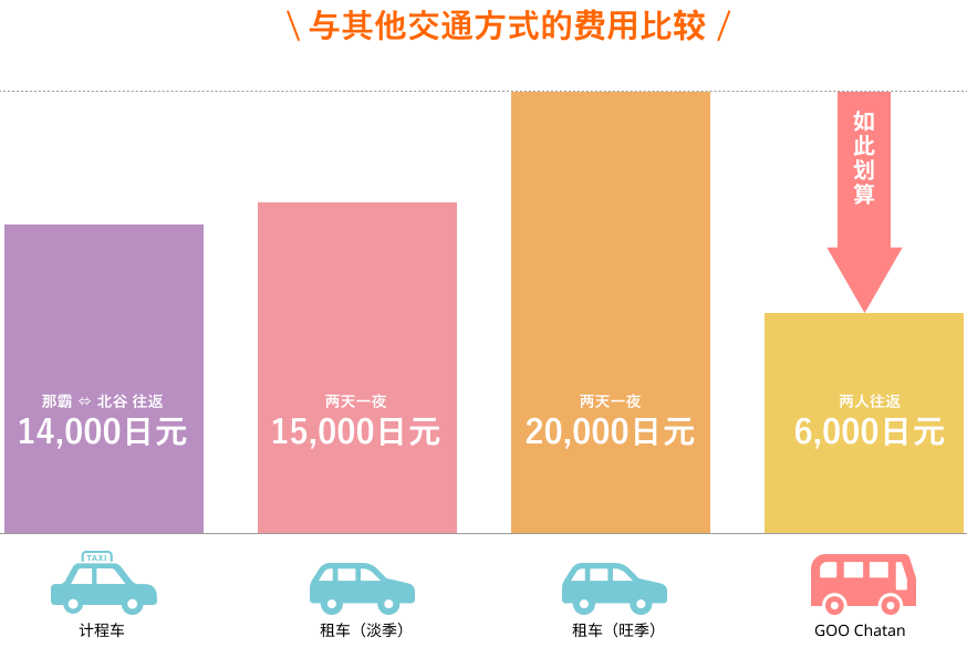从北谷町到冲绳美丽海水族馆,「北谷直达快线」单程每人仅需4,000日元。与其他交通方式相比,若选择出租车,单程费用平均为17,000日元。而如果选择租车,淡季期间1晚2天的紧凑型车辆费用为15,000日元起、在旺季期间,租车费用通常为20,000日元起。此外,还需要考虑近期不断上涨的燃油费用。